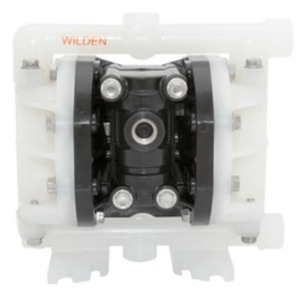Bomba de diafragma doble accionada por aire de plástico atornillada Wilden 00-10181 Pro-Flo SHIFT 1/4″ (6 mm) (AODD) (PS25), MODELO: PS25/PPPPP/TWS/TF/PTF. Caudal máximo 21.6 lpm (5.7 gpm), succión y descarga NPS de 6 mm (1/4″) (NPT/BSP). Partes húmedas de polipropileno, pistón exterior, cámara de aire, bloque central, válvula de aire y asientos, juntas tóricas y bolas de PTFE, diafragma de IPD de PTFE con respaldo Wil-Flex de carrera completa.